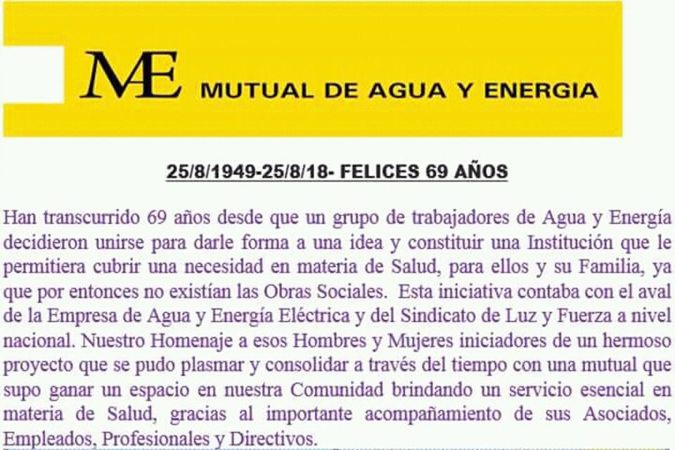La Federación de Entidades Mutualistas de la Provincia de Jujuy, felicita en su Aniversario número 69 a la Mutual de Agua y Energía.