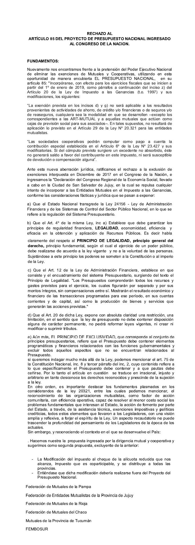 RECHAZO AL ARTÍCULO 85 DEL PROYECTO DE PRESUPUESTO NACIONAL INGRESADO AL CONGRESO DE LA NACION